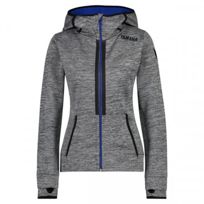 Il design è sagomato per una vestibilità femminile, con cappuccio regolabile, zip frontale integrale e polsini con foro per il pollice. Il colore grigio mélange è impreziosito da dettagli blu Yamaha, tra cui la scritta sul petto e il profilo interno del cappuccio.