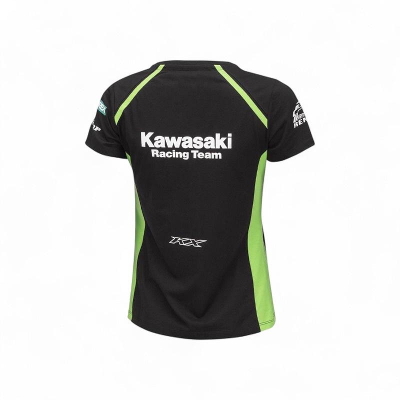 Maglietta donna ufficiale Kawasaki Racing Team, colore nero con inserti verdi. Modello KRT originale, codice 177MXF24100L, ideale per appassionate e tifose Kawasaki.